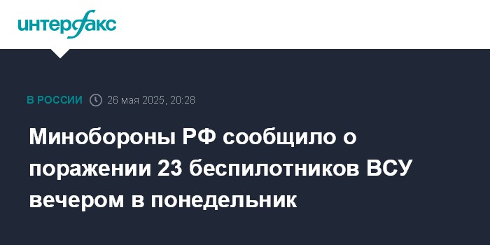 Москва. 26 мая. INTERFAX.RU - Российские военные сбили 23 украинских беспилотника над регионами РФ вечером в понедельник, заявили в Минобороны РФ.