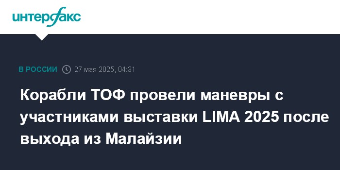 Москва. 27 мая. INTERFAX.RU - Отряд кораблей Тихоокеанского флота (ТОФ) в составе корветов "Резкий", "Герой РФ Алдар Цыденжапов" завершил программу пребывания в Малайзии и принял участие в совместном маневрировании с кораблями-участниками международной военно-морской выставки LIMA 2025, которая проходила на острове Лангкави, сообщила пресс-служба флота во вторник.