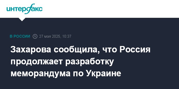 Москва. 27 мая. INTERFAX.RU - Россия продолжает работу над проектом меморандума по ситуации на Украине, по завершении передаст документ украинской стороне, рассчитывает, что Киев поступит аналогичным образом, заявила официальный представитель МИД РФ Мария Захарова.