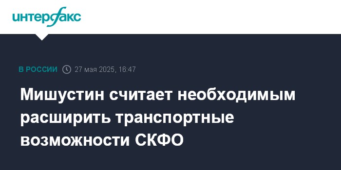 Москва. 27 мая. INTERFAX.RU - Премьер-министр России Михаил Мишустин заявил, что нужно расширять транспортные возможности Северо-Кавказского федерального округа. Он сказал это на на заседании правительственной комиссии по развитию Северного Кавказа.