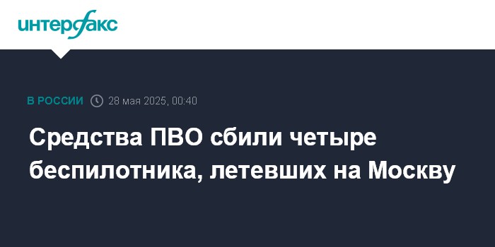 Москва. 28 мая. INTERFAX.RU - Четыре украинских беспилотника, летевших на Москву, уничтожено средствами ПВО, сообщил мэр Москвы Сергей Собянин.