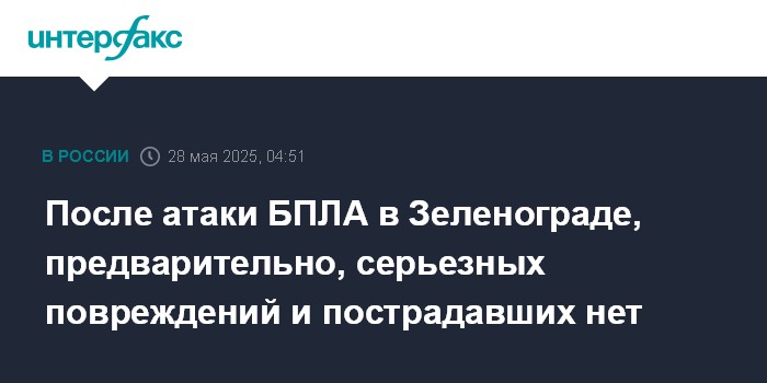 Москва. 28 мая. INTERFAX.RU - Мэр Москвы Сергей Собянин сообщил, что после отражения атаки беспилотников в Зеленограде, предварительно, никто не пострадал, серьезных повреждений не зафиксировано.