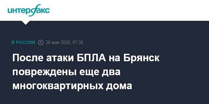 Москва. 28 мая. INTERFAX.RU - Еще два жилых дома были повреждены в Фокинском районе Брянска в результате атаки беспилотников, сообщил губернатор Брянской области Александр Богомаз.