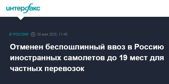 Москва. 28 мая. INTERFAX.RU - Правительство России упразднило порядок, при котором ввоз иностранных самолетов, вмещающих до 19 пассажиров и используемых для частных перевозок на территории Евразийского экономического союза, освобожден от уплаты таможенных пошлин и налогов.