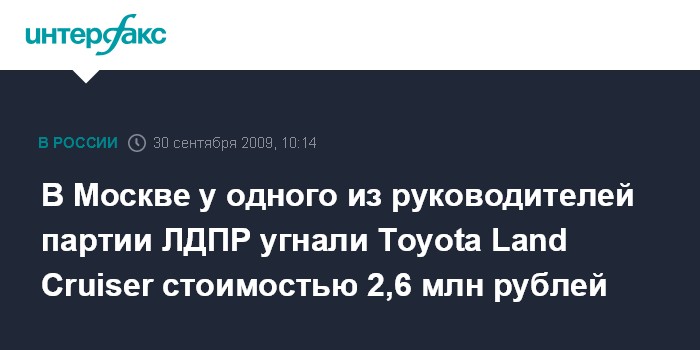 Москва. 30 сентября. INTERFAX.RU – У члена высшего совета партии ЛДПР Владимира Овсянникова в Москве угнали Toyota Land Cruiser-200, ущерб составил 2 млн 600 тыс. рублей, сообщил "Интерфаксу" источник в правоохранительных органах города в среду.