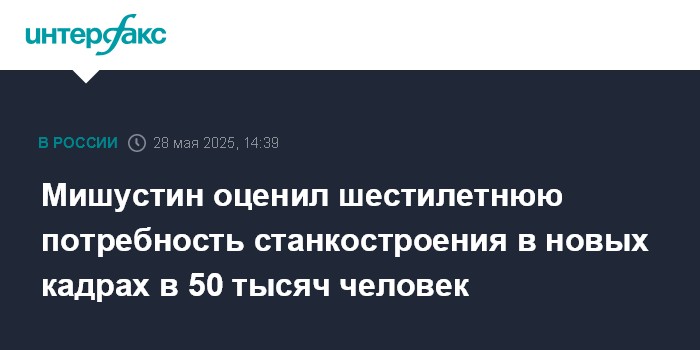 Москва. 28 мая. INTERFAX.RU - Российской отрасли станкостроение в ближайшие шесть лет потребуется дополнительно около 50 тысяч специалистов, четверть из них должна быть с высшим образованием, сообщил на встрече со студентами технических вузов премьер-министр Михаил Мишустин.