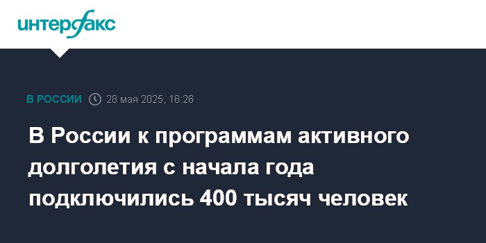 Москва. 28 мая. INTERFAX.RU - Охват программами активного долголетия с начала 2025 года увеличился на 400 тысяч человек; число участников программ составило уже 12,6 млн людей старшего возраста, сообщила пресс-служба Минтруда.