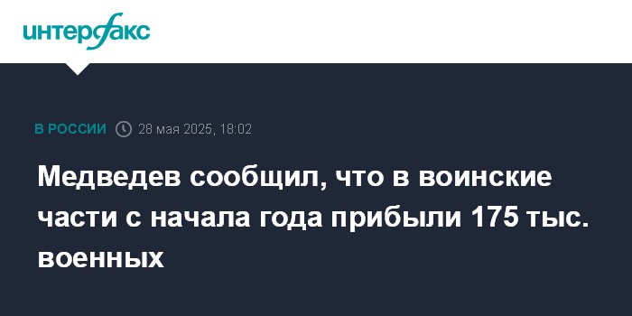Москва. 28 мая. INTERFAX.RU - С начала года в воинские части прибыли почти 175 тысяч военнослужащих, а добровольцев - более 14 тысяч, заявил заместитель председателя Совета безопасности РФ Дмитрий Медведев.