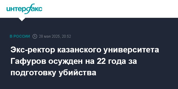 Москва. 28 мая. INTERFAX.RU - Савеловский суд Москвы в среду признал бывшего ректора Казанского федерального университета (КФУ) Ильшата Гафурова виновным в подстрекательстве и подготовке убийства.