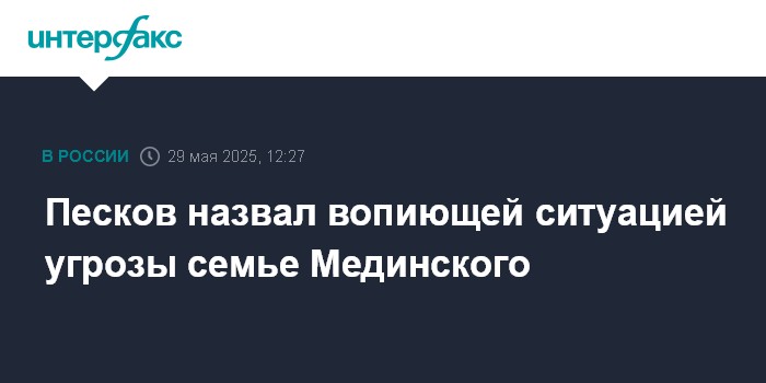 Москва. 29 мая. INTERFAX.RU - Угрозы семье главы российской переговорной команды по украинскому урегулированию Владимира Мединского являются вопиющей ситуацией, заявил пресс-секретарь президента РФ Дмитрий Песков.