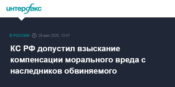 Москва. 29 мая. INTERFAX.RU - Конституционный суд РФ допустил возложение на наследников человека, совершившего преступление и умершего до приговора, обязанности выплатить компенсацию морального вреда потерпевшим.
