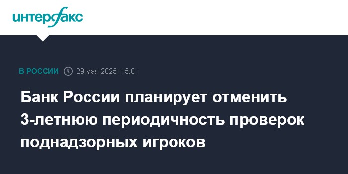 Москва. 29 мая. INTERFAX.RU - Банк России планирует отменить трехлетнюю периодичность проверок поднадзорных организаций, говорится в сообщении регулятора.