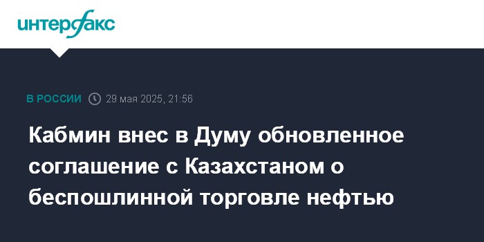 Кабмин внес в Думу обновленное соглашение с Казахстаном о беспошлинной торговле нефтью