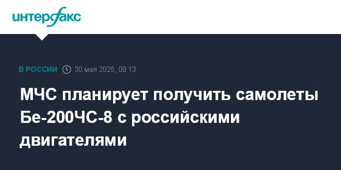 Москва. 30 мая. INTERFAX.RU - Самолет-амфибия Бе-200ЧС-8, который применяется для тушения пожаров, будет оснащен двигателями российского производства, сообщил журналистам глава МЧС Александр Куренков.