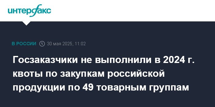 Москва. 30 мая. INTERFAX.RU - Госзаказчики РФ не выполнили в 2024 году требования по квотированию закупок продукции российского производства по 49 товарным группам из 121, следует из отчета Минфина РФ о результатах мониторинга закупок товаров, работ, услуг, осуществляемых в соответствии с законом "О контрактной системе" (44-ФЗ).