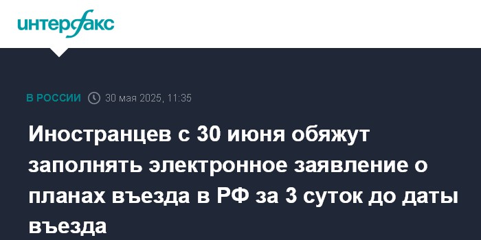 Москва. 30 мая. INTERFAX.RU - В России с 30 июня в рамках второго этапа эксперимента вводится требование о заполнении иностранными гражданами электронного заявления о планируемом посещении страны, которое необходимо оформить не позднее трех суток до даты въезда. Об этом сообщила официальный представитель МВД России Ирина Волк.