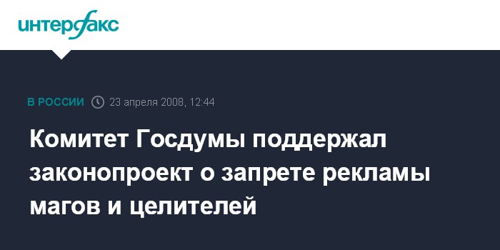 Москва. 23 апреля. INTERFAX.RU - Комитет Госдумы по экономической политике и предпринимательству одобрил законопроект, запрещающий рекламу оккультных услуг и магического целительства, и рекомендовал его к принятию нижней палатой.