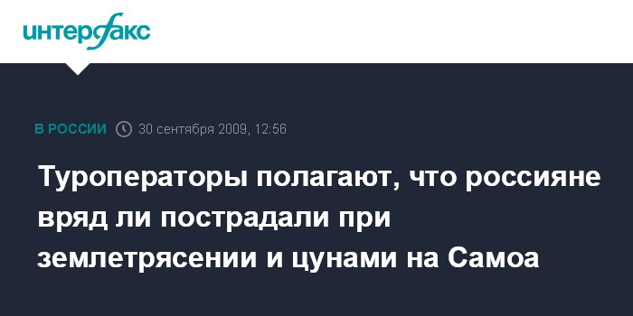 Москва. 30 сентября. INTERFAX.RU - Российские туристы крайне редко посещают Западное Самоа, где только что произошло сильнейшее землетрясение и цунами, поэтому, предполагают туроператоры, их не должно быть в числе пострадавших.