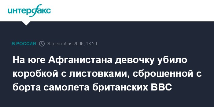 Москва. 30 сентября. INTERFAX.RU - Афганская девочка погибла после того, как на нее упала коробка с информационными буклетами, сброшенная с борта самолета британских ВВС в провинции Гильменд на юге страны, сообщает в среду газета "Таймс".