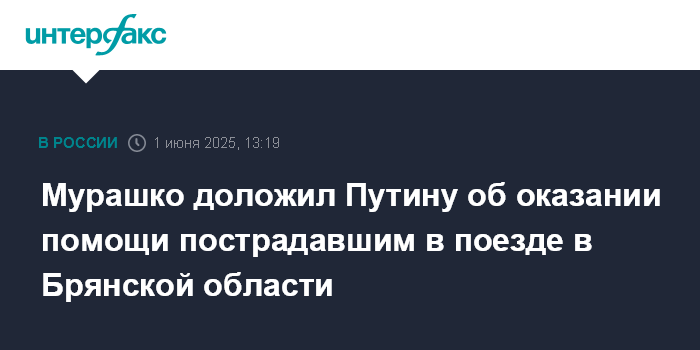 Москва. 1 июня. INTERFAX.RU - Министр здравоохранения РФ Михаил Мурашко доложил президенту России Владимиру Путину о мерах по оказанию помощи пострадавшим на железной дороге в Брянской области, сообщил журналистам пресс-секретарь главы государства Дмитрий Песков.