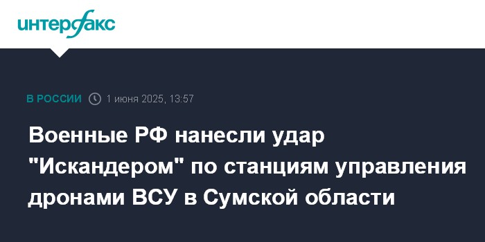 Москва. 1 июня. INTERFAX.RU - Российские военные ракетным ударом уничтожили мобильные станции управления беспилотниками армии Украины в Сумской области, сообщили в Минобороны РФ в воскресенье.