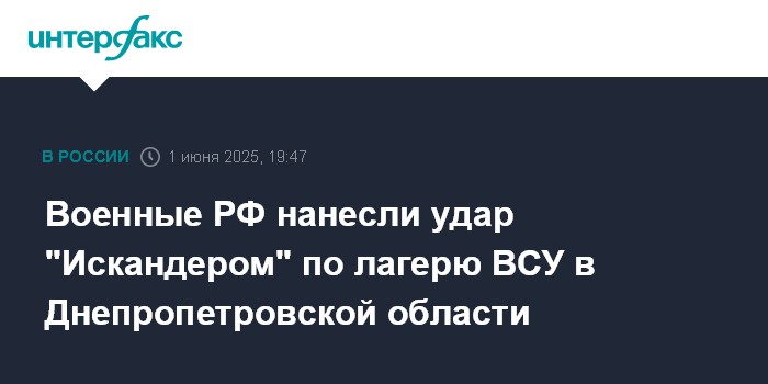 Москва. 1 июня. INTERFAX.RU -Российские военные сообщили, что комплексом "Искандер" нанесен удар по палаточному лагерю ВСУ в Днепропетровской области.