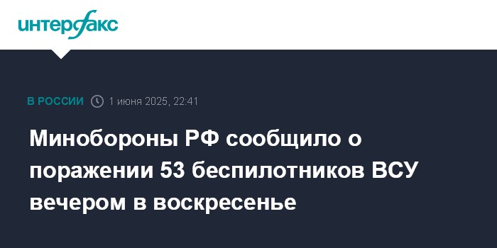 Москва. 1 июня. INTERFAX.RU - Российские военные сбили 53 украинских беспилотника над регионами РФ вечером в воскресенье, заявили в Минобороны РФ.