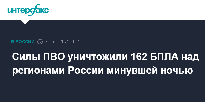 "В период с 20:10 по Москве 1 июня до 02:00 2 июня дежурными средствами ПВО перехвачено и уничтожено 162 украинских беспилотных летательных аппарата самолетного типа", - говорится в сообщении.