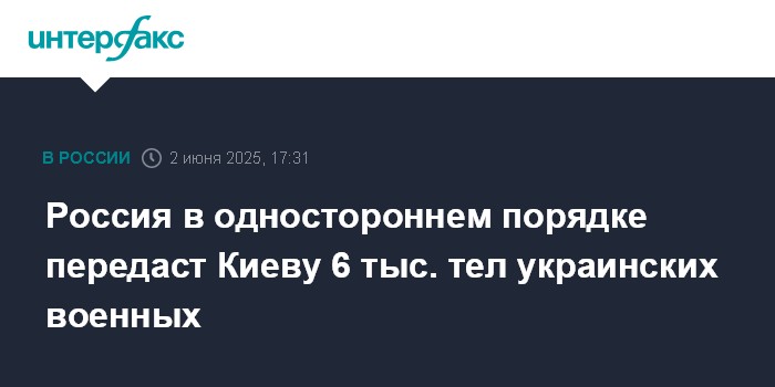Москва. 2 июня. INTERFAX.RU - Россия передаст Украине 6000 тел украинских военных на следующей неделе, заявил глава российской делегации на переговорах с Киевом Владимир Мединский.