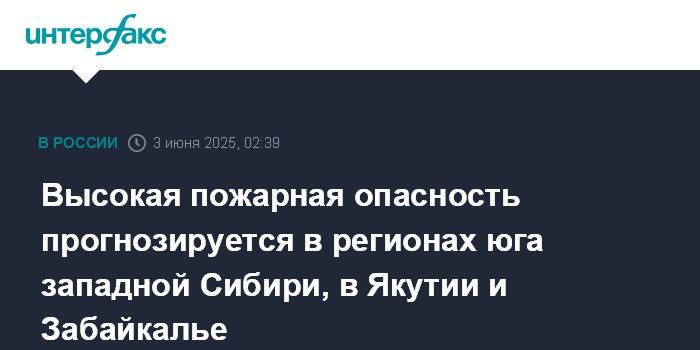 Москва. 3 июня. INTERFAX.RU - Высокий и чрезвычайный классы пожарной опасности прогнозируются в регионах юга западной Сибири, в Якутии и в Хабаровском крае, в Забайкалье, несмотря на понижение температуры и осадки, четвертый и пятый классы пожарной опасности сохранятся, сообщил "Интерфаксу" научный руководитель Гидрометцентра России Роман Вильфанд.