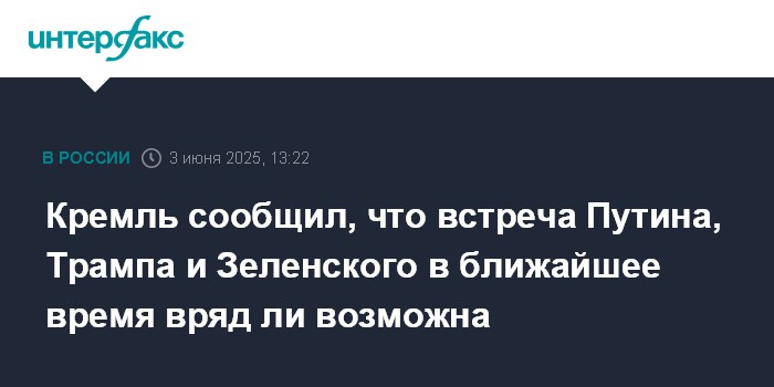 Москва. 3 июня. INTERFAX.RU - Трехсторонняя встреча президентов РФ, США и Украины Владимира Путина, Дональда Трампа и Владимира Зеленского в ближайшее время вряд ли возможна, заявил пресс-секретарь главы российского государства Дмитрий Песков.