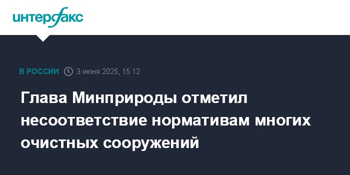 Москва. 3 июня. INTERFAX.RU - Значительная часть построенных очистных сооружений не соответствует нормативам, сообщил глава Минприроды Александр Козлов на встрече с президентом Владимиром Путиным.