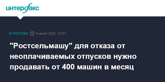Москва. 4 июня. INTERFAX.RU - Компании "Ростсельмаш" в 2025 году необходимо продать 2,5 тысячи единиц сельхозтехники, чтобы не отправлять сотрудников в неоплачиваемый отпуск, сообщила в Telegram вице-спикер Госдумы Виктория Абрамченко.