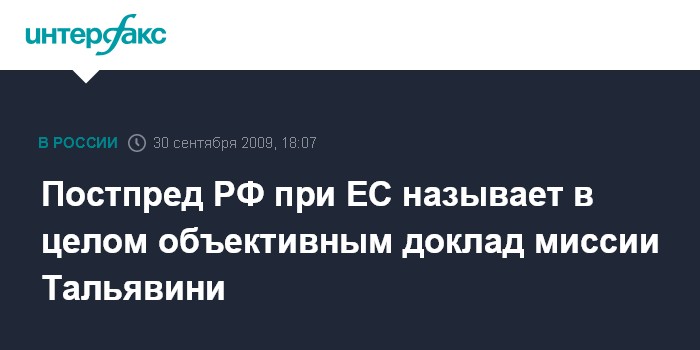 Брюссель. 30 сентября. INTERFAX.RU - Российская сторона расценивает как в целом объективный доклад независимой комиссии по расследованию обстоятельств августовского конфликта августа на Кавказе в 2008 году, и подчеркивает, что в нем ответственность за развязывание конфликта возложена на Грузию.