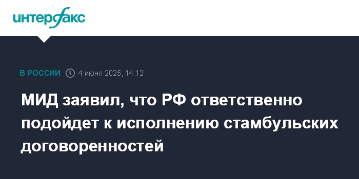 Москва. 4 июня. INTERFAX.RU - Россия намерена ответственно подойти к исполнению договоренностей, достигнутых в ходе российско-украинских переговоров в Стамбуле, заявила официальный представитель МИД РФ Мария Захарова.