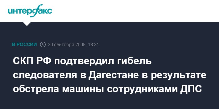 Москва.30 сентября. INTERFAX.RU - В СКП РФ подтвердили факт гибели в Дагестане сотрудника ведомства в результате обстрела автомашины, в которой находились следователь и оперуполномоченный.