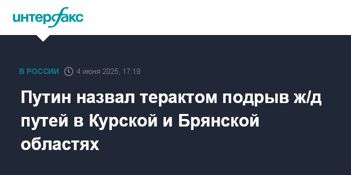 Москва. 4 июня. INTERFAX.RU - Подрыв железнодорожных путей в Брянской и Курской областях являются терактами, решение об их проведении принималось на Украине на самом высоком уровне, заявил президент РФ Владимир Путин.
