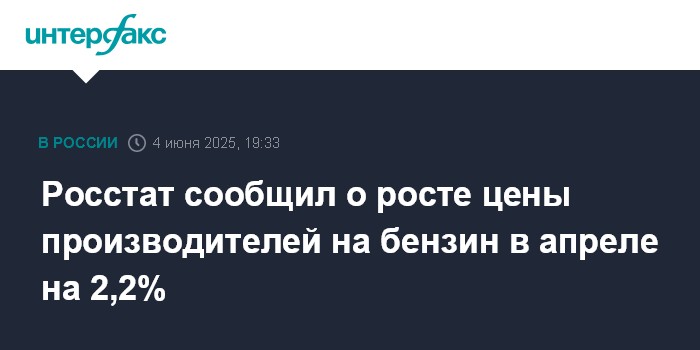 Москва. 4 июня. INTERFAX.RU - В России в апреле 2025 года цены производителей на бензин перешли к росту после снижения в предыдущие шесть месяцев, поднявшись на 2,2% относительно марта, сообщил Росстат.