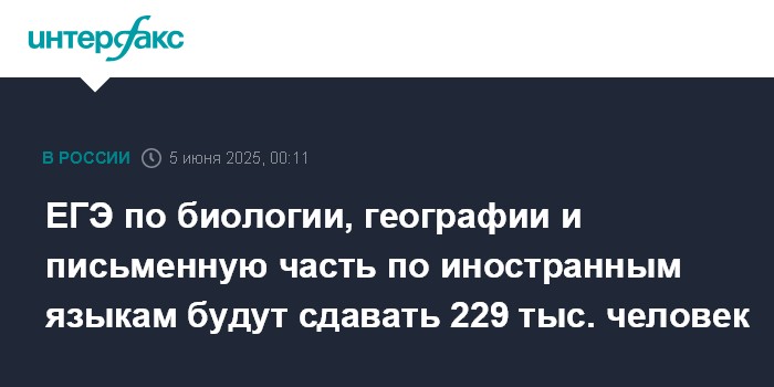 Москва. 5 июня. INTERFAX.RU - Более 229 тыс. человек собираются сдавать 5 июня Единый государственный экзамен (ЕГЭ) по биологии, географии, а также письменную часть по иностранным языкам, среди которых английский, французский, немецкий, испанский и китайский, сообщили журналистам в пресс-службе Рособрнадзора.