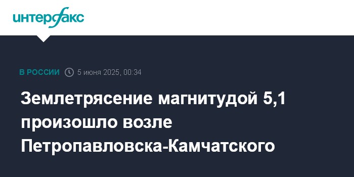 Москва. 5 июня. INTERFAX.RU - Сейсмологи зарегистрировали землетрясение магнитудой 5,1, которое произошло в ночь на четверг в акватории Авачинского залива у восточного побережья Камчатки, сообщает региональный филиал Единой геофизической службы РАН.
