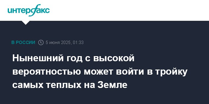 Москва. 5 июня. INTERFAX.RU - С вероятностью 90% 2025 год войдет в тройку самых теплых на Земле за всю историю метеонаблюдений, сообщил научный руководитель Гидрометцентра России Роман Вильфанд.