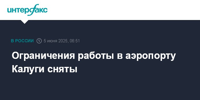 Москва. 5 июня. INTERFAX.RU - Ограничения на прием и отправку воздушных судов сняты в аэропорту Калуги, сообщил представитель Росавиации Артем Кореняко.