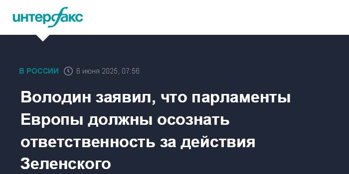 "Парламенты европейских государств должны осознать свою ответственность за действия Зеленского. Которые он предпринимает во многом с их одобрения или молчаливого согласия", - написал Володин в своем телеграм-канале в пятницу.
