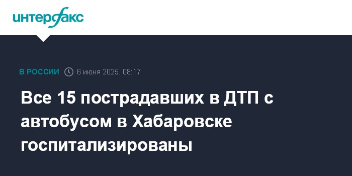 Москва. 6 июня. INTERFAX.RU - После ДТП с экскурсионным автобусом в Хабаровске на лечении в стационарах находятся 15 человек, в том числе 13 детей, сообщил в пятницу главный врач краевой клинической больницы имени профессора О. В. Владимирцева Александр Калашников.