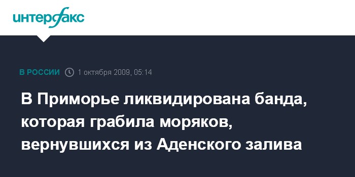 Владивосток. 1 октября. ИНТЕРФАКС-ДАЛЬНИЙ ВОСТОК - В Приморье сотрудники уголовного розыска ликвидировали преступную группу, члены которой грабили матросов-контрактников Тихоокеанского флота, вернувшихся из Аденского залива, где они охраняли гражданские суда от нападения пиратов.
