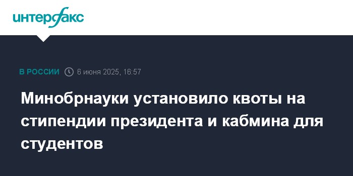Москва. 6 июня. INTERFAX.RU - Минобрнауки РФ установило квоты на стипендии президента и правительства РФ для студентов, курсантов и слушателей, обучающихся по образовательным программам высшего образования, для конкурсных групп на 2025-2026 учебный год.