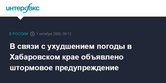 Москва. 1 октября. INTERFAX.RU - В Хабаровском крае в связи с циклоном в выходные дни ожидается резкое ухудшение погоды, объявлено штормовое предупреждение. "В эти дни в северных районах края пройдут дождевые осадки, местами сильные, на охотском побережье ожидается усиление северного ветра до 18-23 метров в секунду", - сообщили агентству "Интерфакс - Дальний Восток" в пресс-службе МЧС края в четверг.
