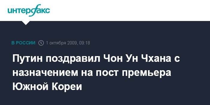 Москва. 1 октября. INTERFAX.RU - Председатель правительства России Владимир Путин направил поздравительную телеграмму премьер-министру Республики Корея Чон Ун Чхану в связи с его назначением на этот пост, сообщили "Интерфаксу" в четверг в пресс-службе правительства РФ. "Хотел бы подтвердить заинтересованность в дальнейшем развитии дружественных российско-корейских отношений, расширении взаимовыгодного сотрудничества в торгово-экономической, научно-технической, культурной и других областях", отмечается, в частности, в телеграмме.
