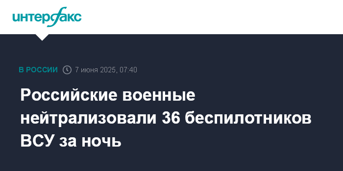 Москва. 7 июня. INTERFAX.RU - В ночь на субботу силы противовоздушной обороны перехватили и уничтожили 36 беспилотников над российскими регионами, сообщили в Минобороны РФ.