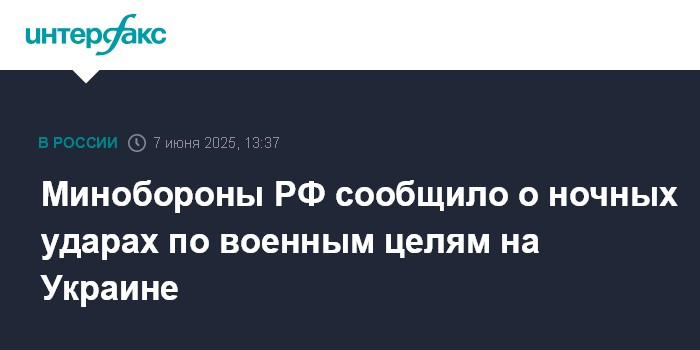 Москва. 7 июня. INTERFAX.RU - Вооруженные силы России ночью нанесли групповые удары высокоточным оружием большой дальности и БПЛА по военным целям на Украине, сообщает министерство обороны РФ.